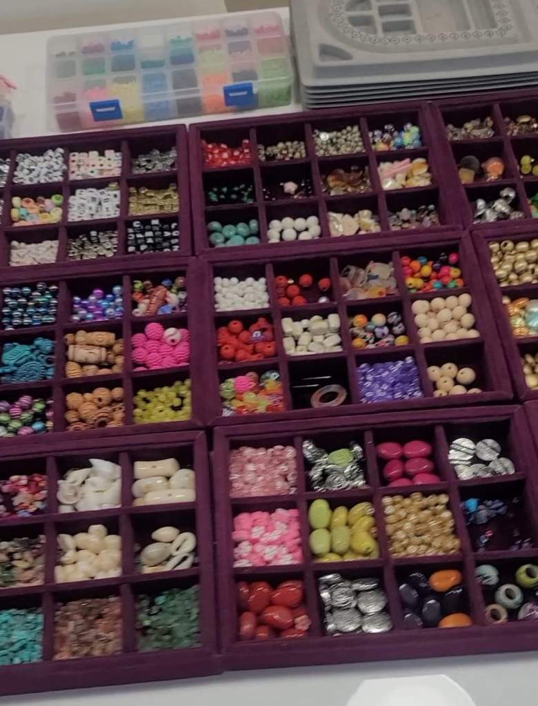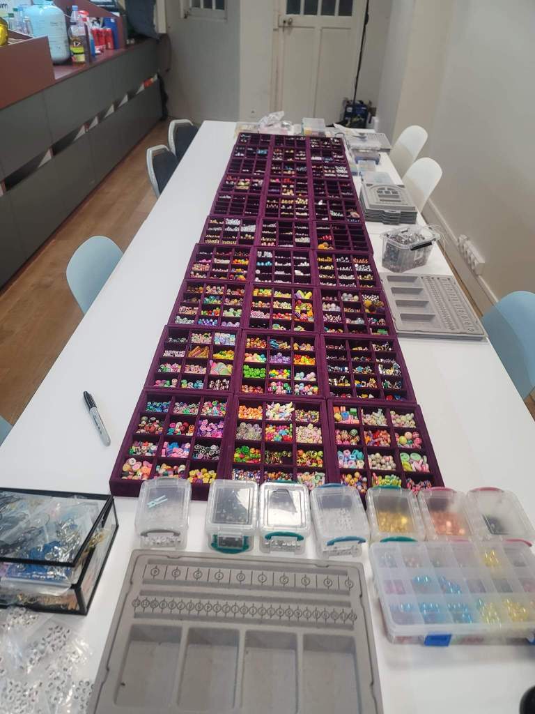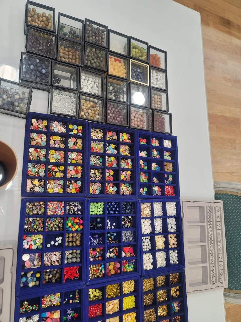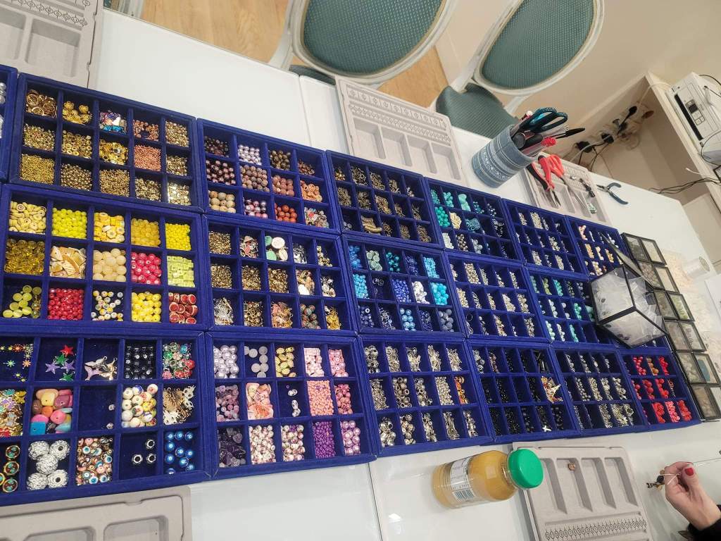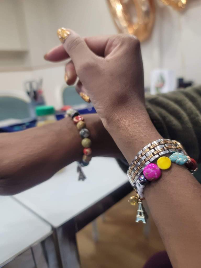 I messaged the host Gulya of the Airbnb experience that we would be about 15 minutes late due to ticketing issues (which she said was fine). We finally at 11:20am at The Nice Bracelet. The space was big and there were tables with all sizes, styles, shapes and colors of beads. Gulya offered us drinks and showed/told us how the process would work and then let us get our beads. With more than enough choices, we took our time and I tried scanning all options.