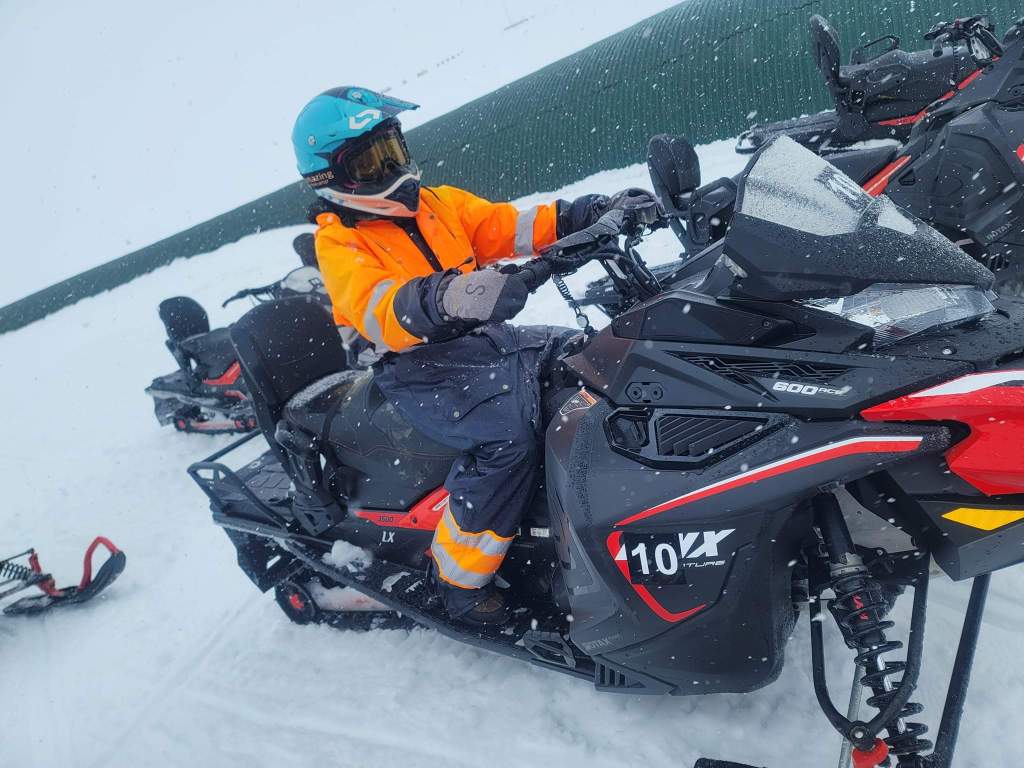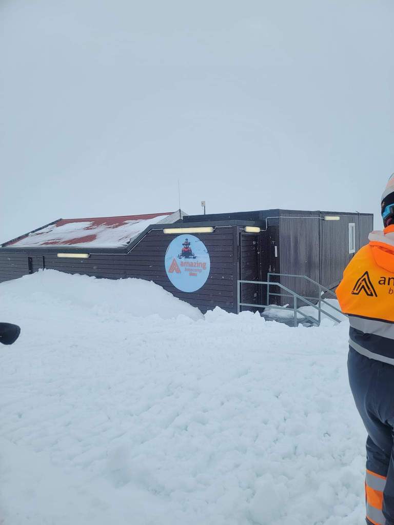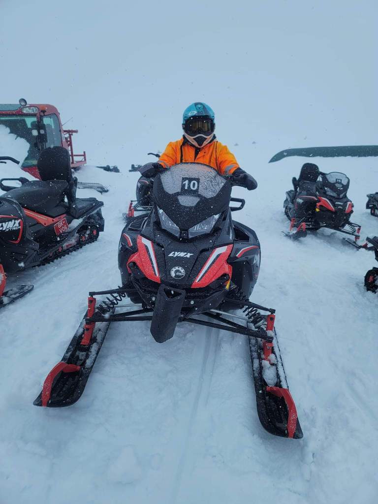 We arrive at the base on the glacier Langjökull and were given instructions by our guide Arnie. Arnie did a great job showing us how to operate the snowmobiles with the most important functions: on, off, brake and accelerate along with a few others that weren’t necessarily needed during our ride. Everyone understood and had a shared ride so since each snowmobile was a 2 person ride the person that drove up would be different from the person driving back.
