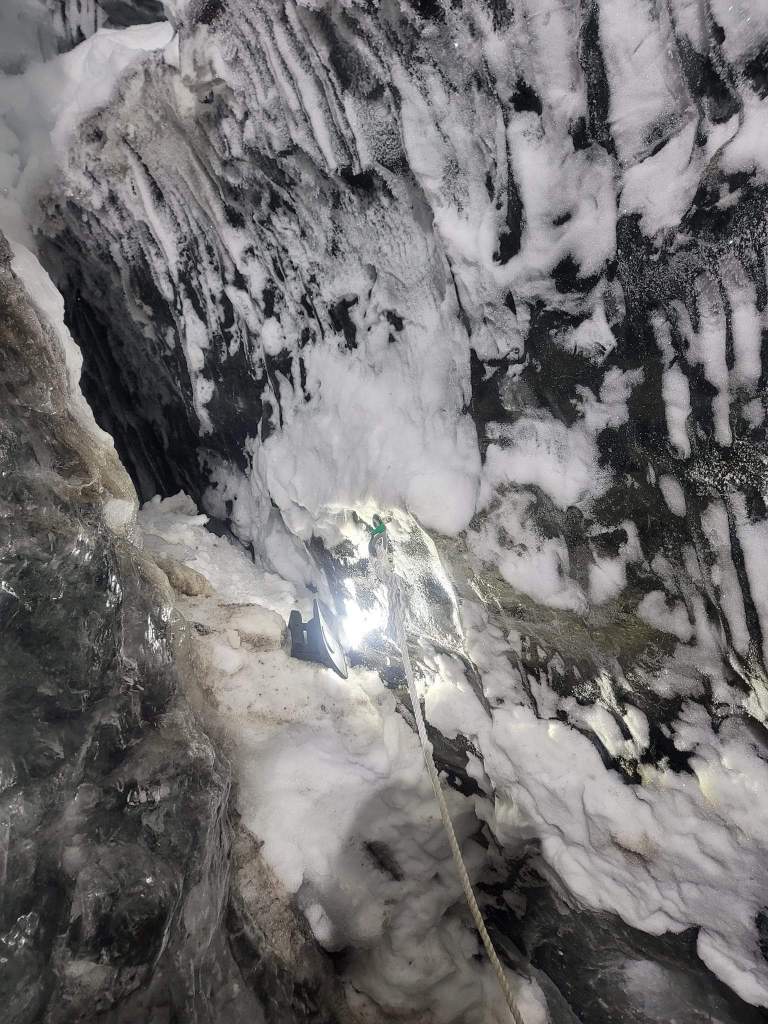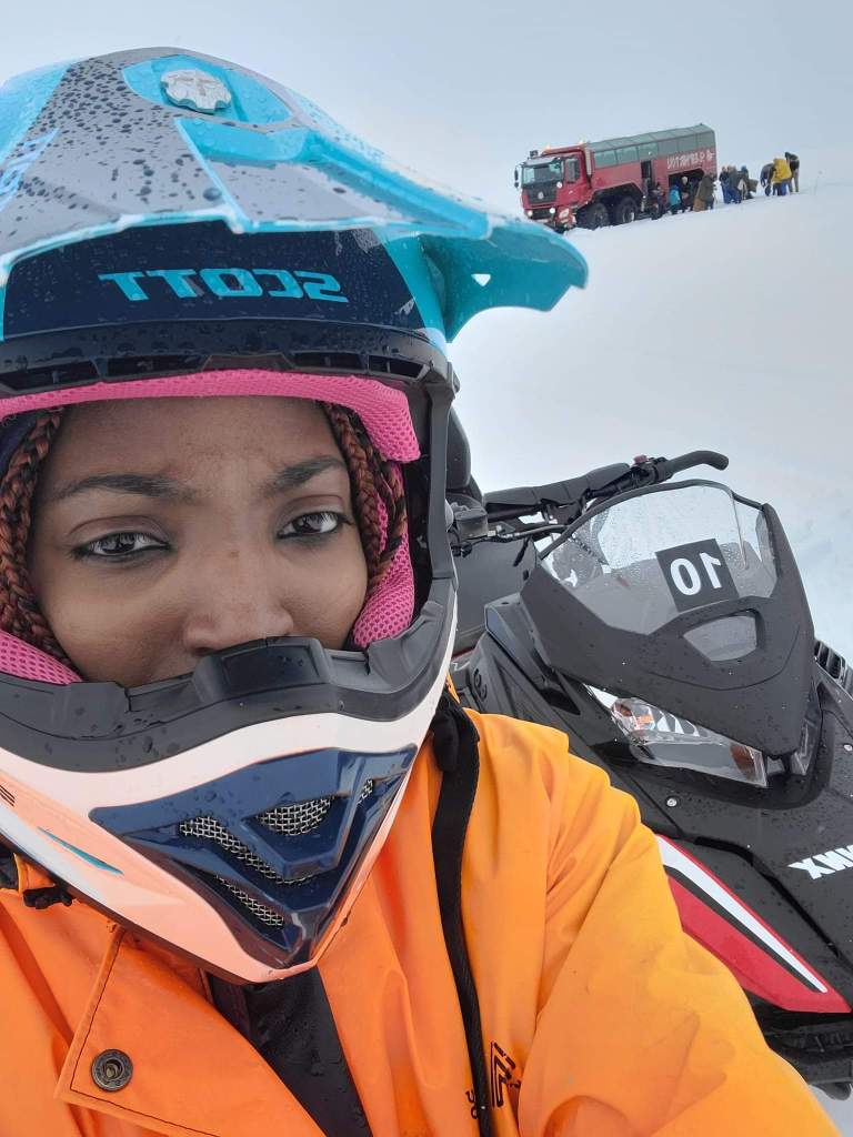 I drove up to the ice cave while Kassandra drove back and seeing as though this was our 1st time doing this we did well. I would say manuvering is easily adjustable but keeping up and trying to stay a safe distance (and taking overall safety into account) is what was the toughest part (we got it done though). For me I was worn out a little bit after getting off (due to the reasons mentioned above). At the top all you could see was white and it was snowing. We all got a chance to go in the ice cave and what a narrow entrance although the inside was bigger. Ducking down (especially if we kept our helmets on) we had to watch our heads. Inside there were steps and a rope you hold onto and once inside there’s a spot in which we were all able to spread out and sit down. We were told a bit of information about the glacier and glaciers in general. We took some photos and videos once inside and stayed for about 15-20 mins. After coming out it was time to drive back from whence we came so we switched and Kassandra drove back. Snowmobiling was really cool and I enjoyed it; it’s definitely something that I would do again.