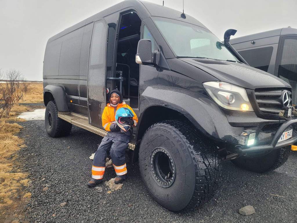 Back at the glacier base we took some photos and videos and boarded back onto the super jeep. The snow seemed to be picking up now so it was a good thing we were wrapping things up. Right in front of us was a monster Jeep paving the way (although that actually made it harder for our smaller vehicle). Back at basecamp we took some last photos and turned our gear back in. Now a few people took the time to grab food or something to drink. Ironically the girl from Doha said she was able to see the Northern lights on Monday while showing me pictures (they were nice). I definitely emailed our tour company that night to let them know because he said he had confirmed with other guides that they didn’t see anything.
