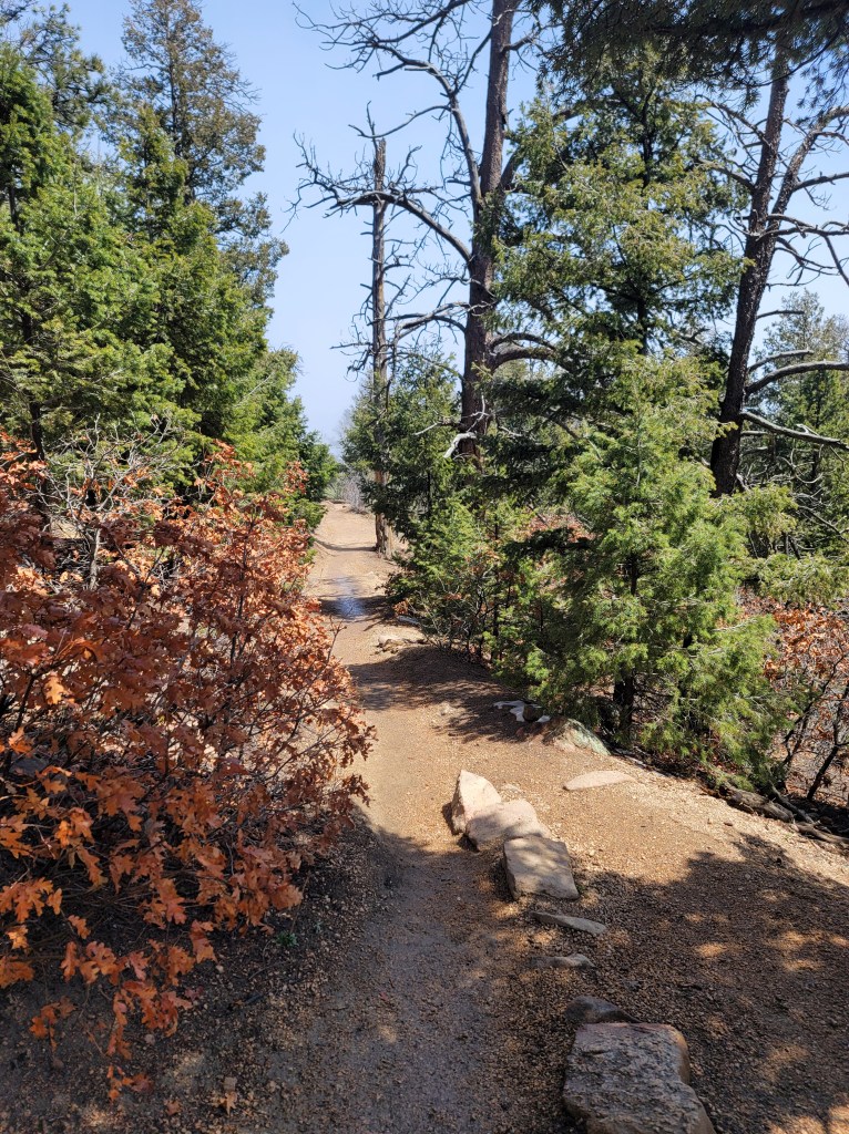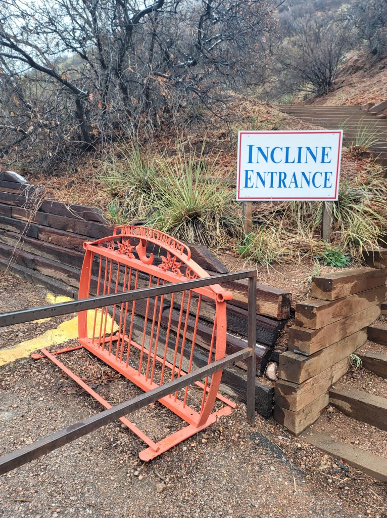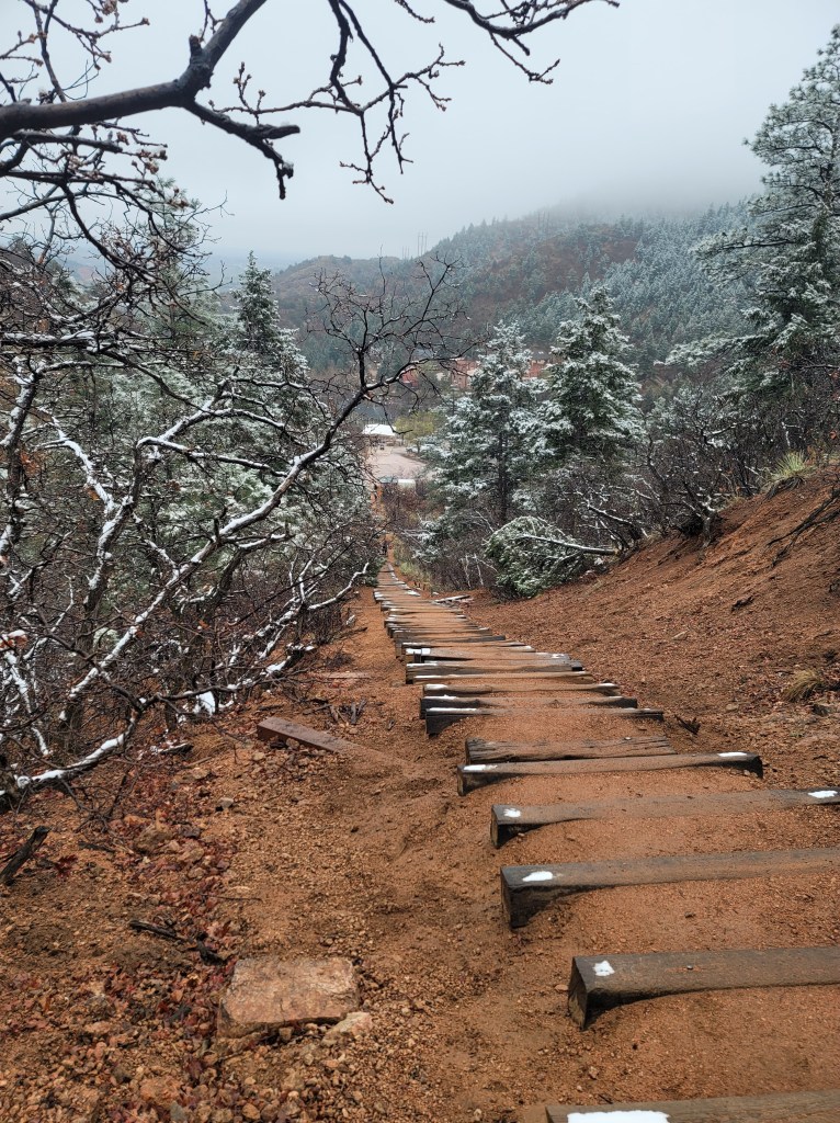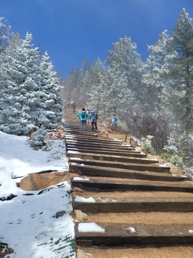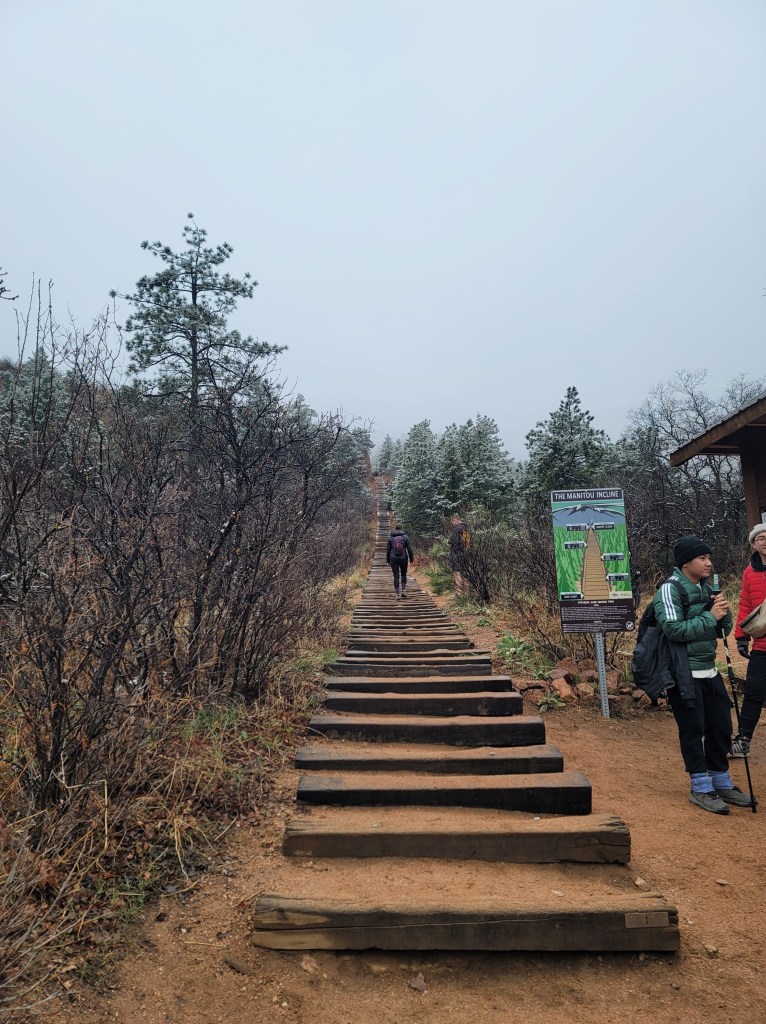 My reservation (it was free but times are assigned) was at 8am for the Manitou Incline and I knew I was going to end up showing up later (I arrived around 10am). I drove 85 miles to Colorado Springs to get to the Manitou Incline. It’s better to park offsite at Hiawatha Gardens, pay a few dollars to park and take the free shuttle to the Incline. There were a good group of us that loaded the shuttle and before we knew it we were at the basecamp of the Incline. Though I was a solo traveler I did my best to stay in sight of groups throughout the hike up and down.