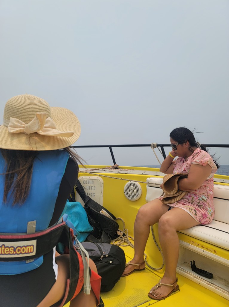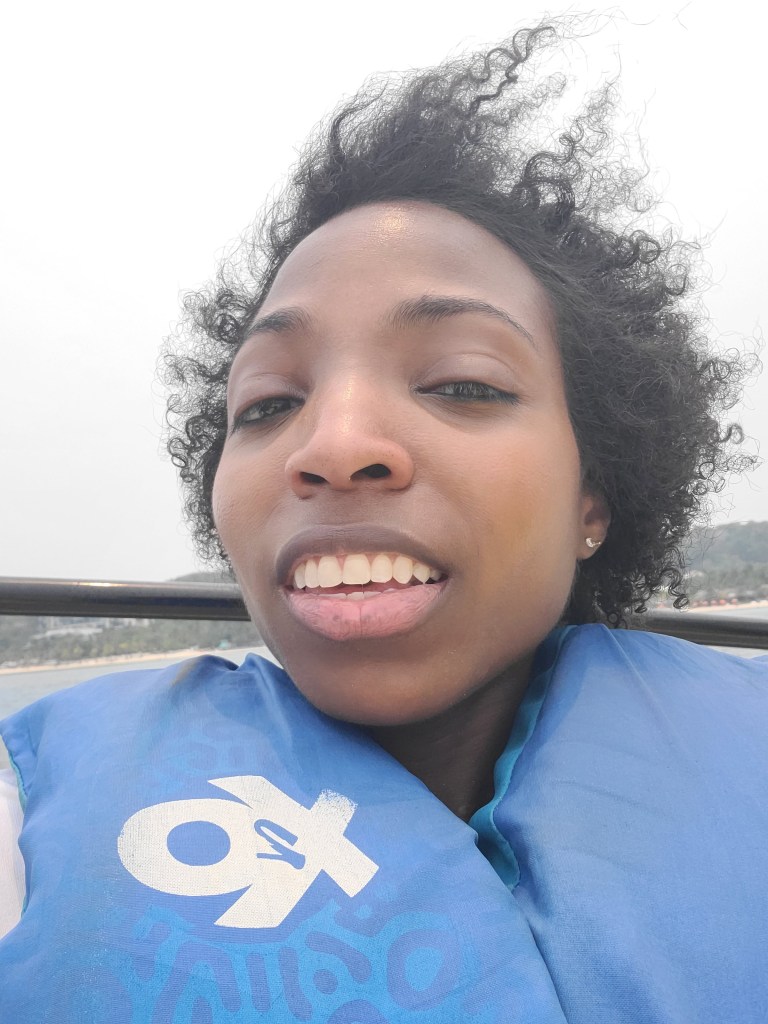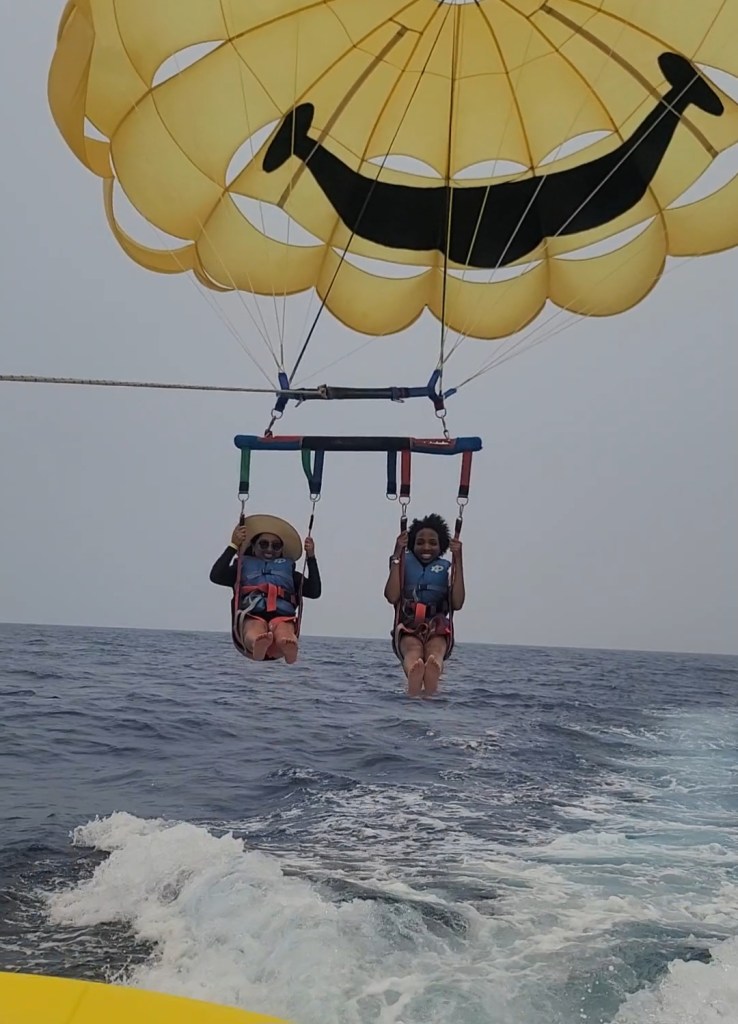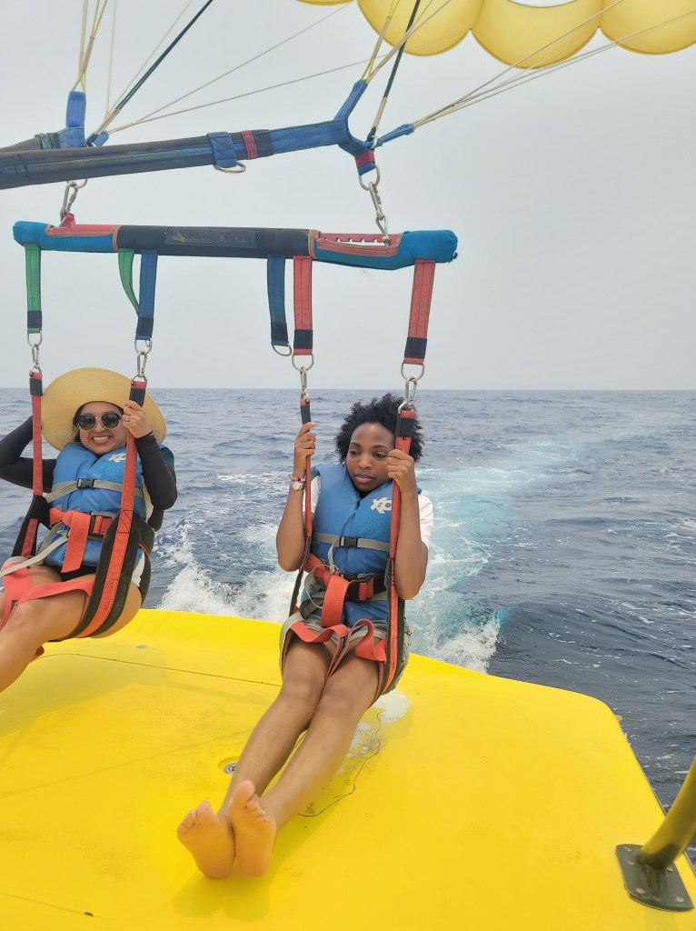 The feeling I felt while up in the air with the wind beside me on both sides, under my feet and above my head…this is what living feels like. As we got higher and further from the boat it all became real and again just a feeling of gratefulness fell upon me. As I looked down and around I couldn’t for too long because I was like, “Whew we are really high up, the boat looks itty bitty” so at point (or two) I did close my eyes. After being up and riding around with the boat below he brought us in but not without dipping us in the water first (which I was not expecting but was wondering how we’d land). We were unstrapped and got to enjoy the ride back to the beach. This was truly an experience that was so worth it!