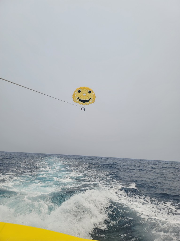 My guide was so surprised and excited that he grabbed his phone and raced towards them signaling me to follow. He asked me if I had my phone and I said no I was afraid I’d drop it or get it wet (especially with this being my first time jet sking). He managed to get close and get some good videos and pictures and so did the people on another boat nearby. I thought it was pretty cool to see them out in the water with us (or I should say we’re out there with them-them being the dolphins) and there were at least 6 of them. I got a chance to see them come up out of the water a bit and follow each other as they went there own way; it was pretty cool. While my guide did that and after I got my fixation of looking at the dolphins I did some more laps in the water and told him I was ready and done. Time was ticking and though jet sking was cool parasailing was an absolute must before I go.