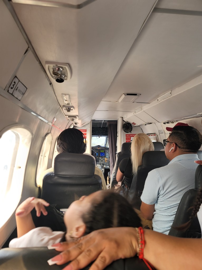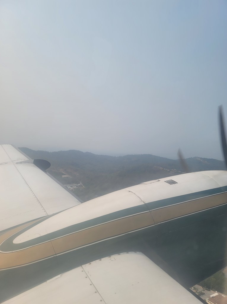 Finally they lined us up for the flight and it wasn’t a lot of us. A gentlman and I realized early on (the one I was easedropping on) that we were going to the same place so while delayed we kept inquiring with staff on updates and would update each other. His wife informed me that it’s because of the fire that a lot of flights are getting delayed due to the smoke and fog. As we go outside there’s this little CM Airline plane so small that my seat 13A didn’t even exist inside so I sat in 6A right by the wing (emergency exit). It was a one by two 20 passenger plane where you can see the cockpit from the back row. There was no air on board just a little fan in the front so people were fanning themselves.