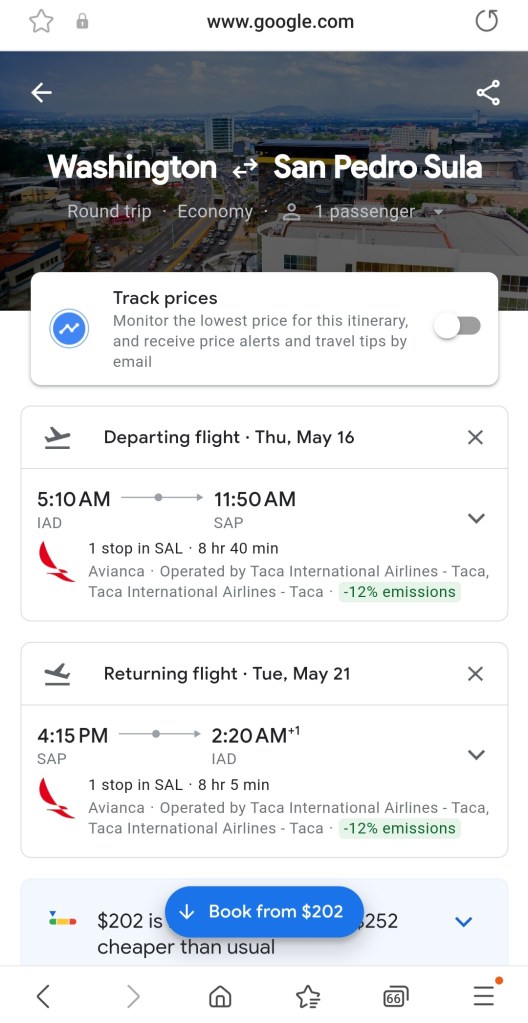 I can’t tell you exactly how I found out about San Pedro Sula, Honduras specifically (I’m guessing it had to be directly through Avianca) but the deal I got was thanks to a post somewhere on social media declaring August 23, 2023 as “Cheap Flight Day.” I saw and read this article and ended up finding this flight that day. The Honduras was not on my radar of places to go to at all and it’s because of that deal that I went. I bought the ticket for $202 roundtrip from Dulles (IAD) to San Pedro Sula (SAP) with a layover in El Salvador. I’ve said it before and I’ll say it again, anytime I can get a roundtrip flight that’s international (especially if I haven’t been there yet) for about $200 roundtrip I’m booking it immediately (it costs more to fly across the country most of the time).