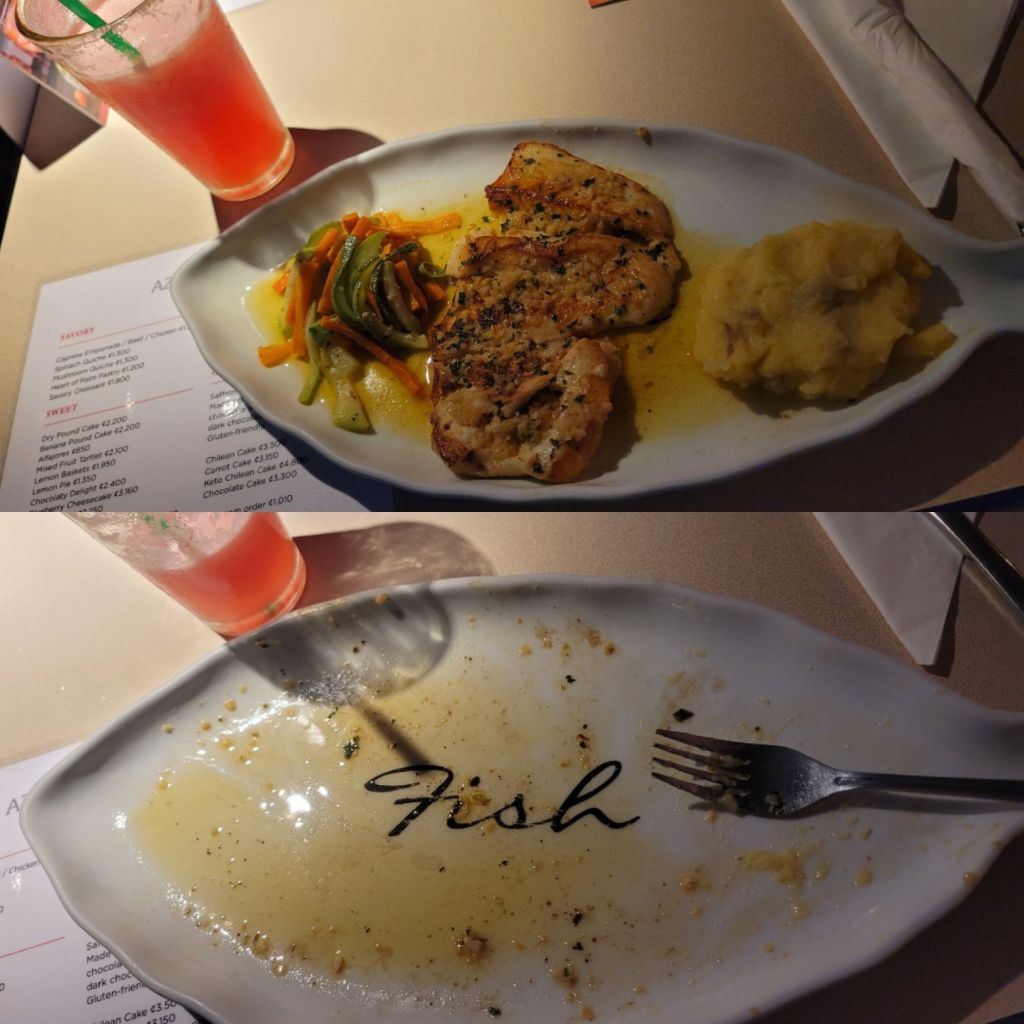 The plan was to get up at 2pm, find somewhere to eat near the grocery store (which was close by) and come back and have time before the bar crawl tonight. Apparently you can only pay cash on Didi so we went to the neighboring cafe to get change. As we waited there for a Didi the arrival time changed so much until finally a new driver was given. We chose to go to a restaurant called “Azafran”. Our meals were delicious (my mom had steak tips with rice and salad and I had garlic sea bass, mashed potatoes and vegetables) and we left nothing on the plate. If the food here in Costa Rica is as good as that then we will be eating good.