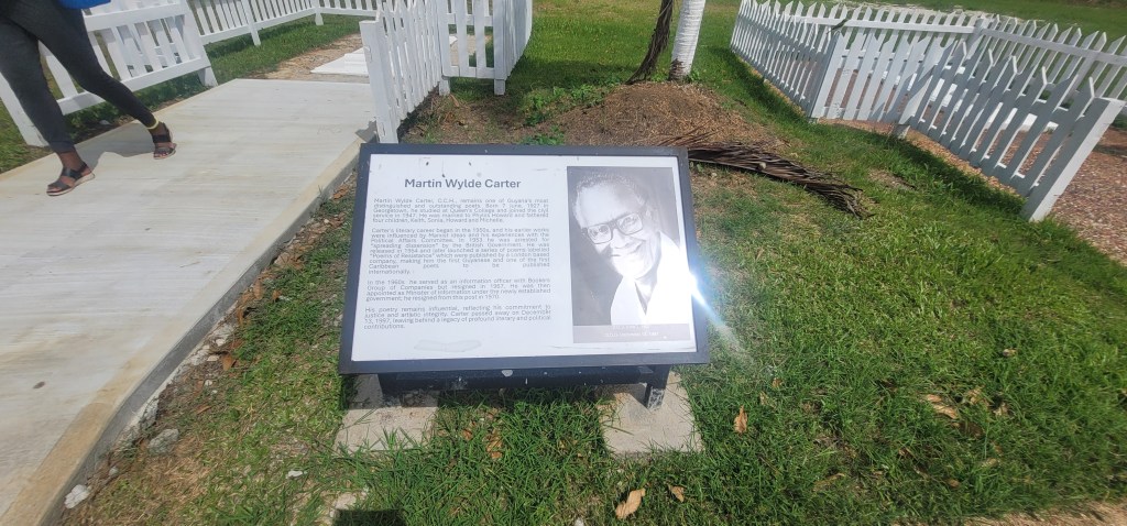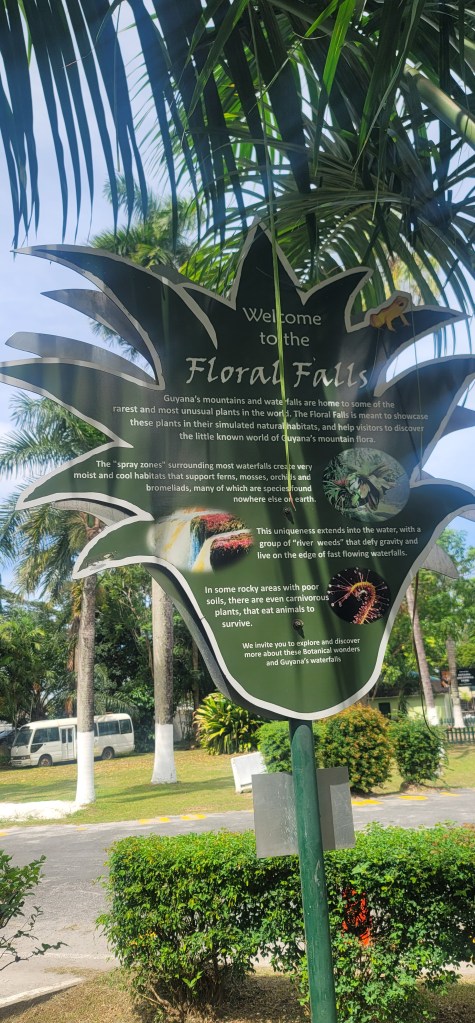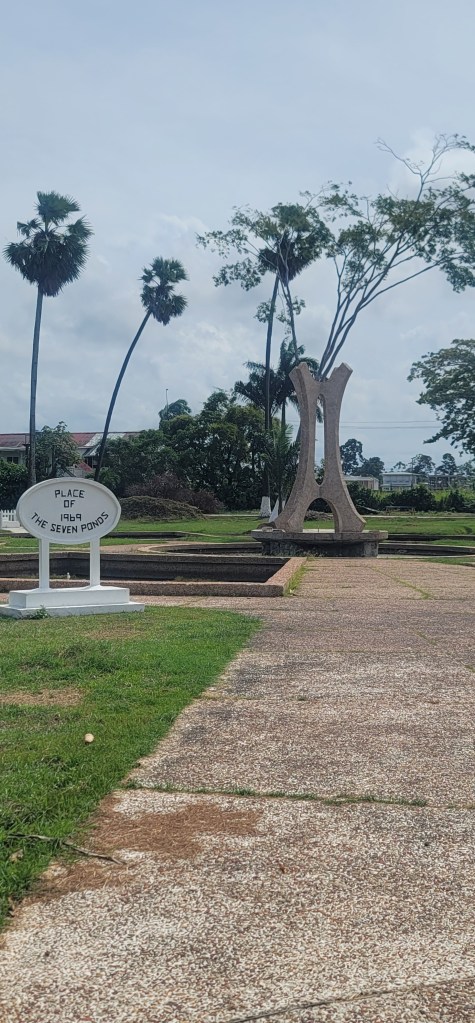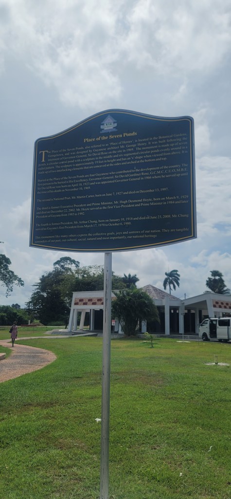 After going to bed last night after 4am chatting, I didn’t really end up really going to sleep until it began to get light outside and for some reason I didn’t sleep well or long at all last night. I decided I’d be up and ready by 11am for the day the night before but was somewhat dragging this morning. After a lite breakfast in house we caught a ride to the Botanical Gardens. We wandered into an area called Floral Falls and got a chance to see some pretty flowers around the site. There we also stumbled upon “The Place of 1969 The Seven Ponds” also known as “Place of Heros”. The concept behind this is a way to honor 4 Guyanese who contributed to the development of the country (pictured below). It is said, “The monument like many others express the collective goals, joys and sorrows of our nation. They are tangible reminders of our past, our cultural, social, natural and most importantly national heritage.”