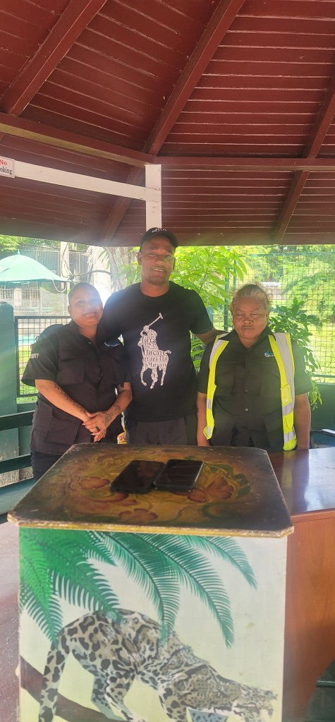 After we explored all of the Guyana Zoo we requested a taxi at the front where security was and they gladly assisted us. It took the taxi a very long time to get to us and we had to have waited at least 45 minutes. We were in good company though as we chatted with the three security officers there (and they were funny). You could tell that they had a good dynamic amongst themselves but they also warned us of a few things (mostly not to look/act like a tourist while out (they said that’s an easy way to get robbed), trust no one, and the obvious of not being out late when it’s dark) and shared some things/places in case we were interested in doing/going to them. We thanked them, got a photo of them (see below) and after what seemed like forever got in the taxi.
