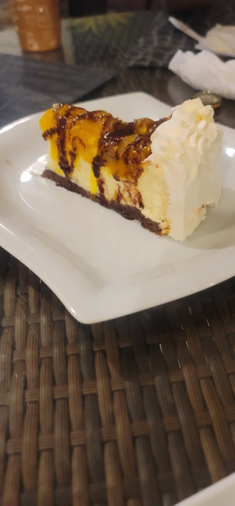 They brought back a passion fruit chocolate chip cheesecake and we thanked him and took a spoonful. I grabbed a small spoonful because I don’t think passionfruit and I get along so I got just a baby piece. As soon as I put it in my mouth Benny mentioned that he tasted almond flavor and I stopped and scooped it right back off of my tongue before I could swallow it (y’all, I’m allergic to nuts, all types of nuts). It would only be a few minutes before I knew if I successfully was able to completely avoid me getting any type of reaction.