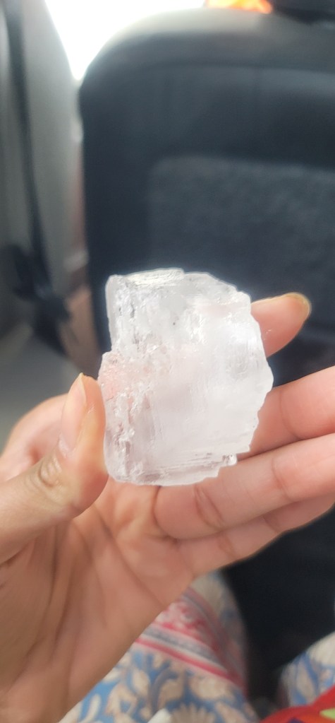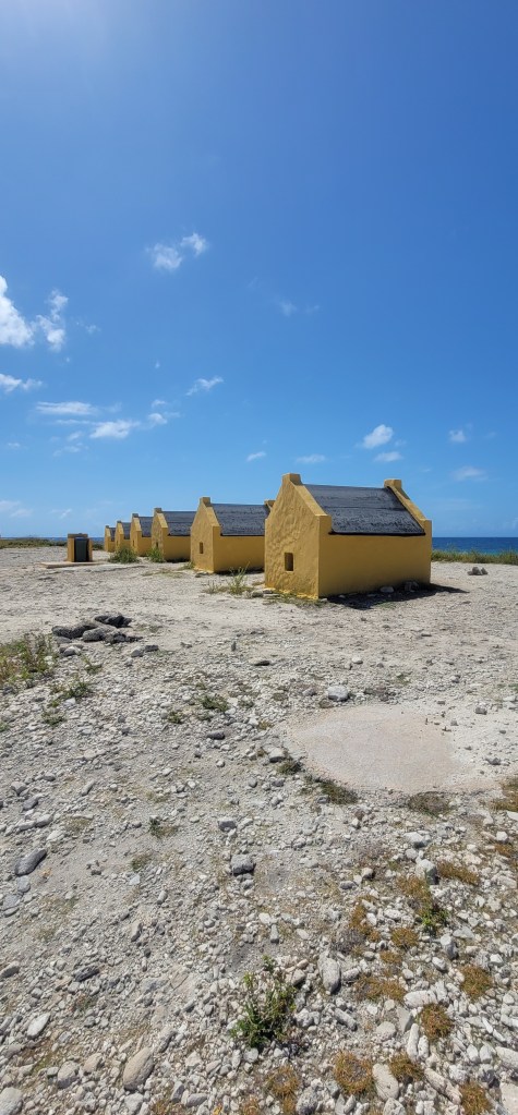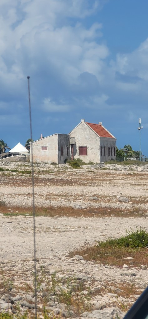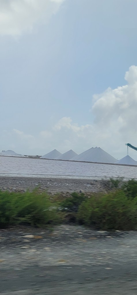 We passed by the salt mountains and the pink color is a result of the micro-organisms the flamingos eat being amplified and it sits for about a year until the water evaporates; It becomes white and then pink. Seeing this in person was a beautiful sight and really spectacular. The salt produced here is 99.7% pure salt and Vanessa had a piece ready to give to all of us (I have a nice chunk). The salt mountains are actually big chunks of salt versus fine salt toppled like a pyramid. The slaves that worked with the salt before there were machines ended up developing sore hands and feet and becoming half blind being out in the sun for continous hours everyday. In 1850 slave huts were built for them with 6-8 people often being in one and sometimes it being 8-10 people. As we stopped on the side to get a closer look I went in one and sat in the doorway. It’s too small inside for that many people. I couldn’t even smile when taking the photo instead I just imagined how they would’ve felt.