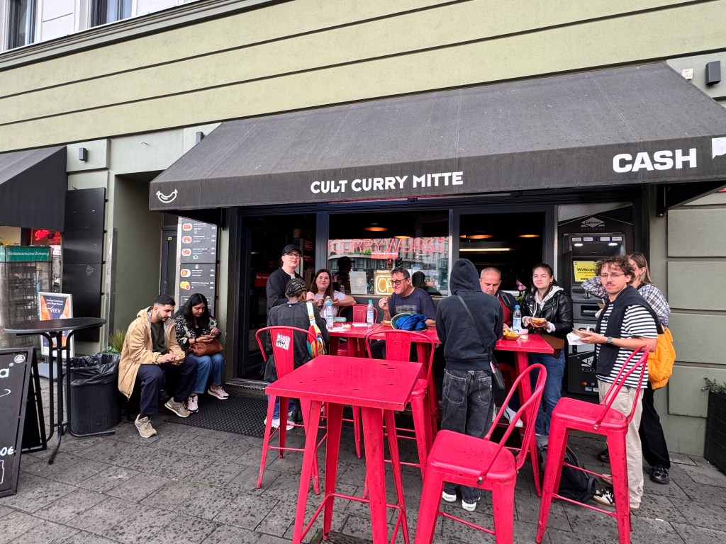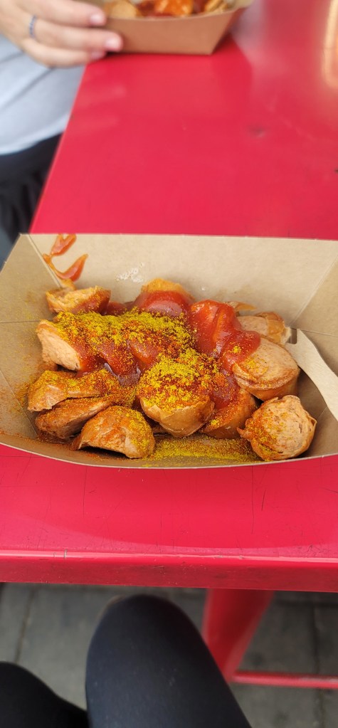 Next we were onward to the next location and I told Ines that I might walk a little slower than usual but I’ll still be able to keep up with the group I just might be in the back due to my ankles. We had 5 stops to go to so I prepared my mind to be in for a good bit of walking, which in this case everything I do will involve a good bit of walking, it’s just pacing myself. Our next stop Cult Curry Mitte was probably my favorite as I had a true German dish currywurst and loved it. It’s a simple dish made of sausage and curry ketchup and then we had fries with a garlic mayo sauce…delicious. Now here’s the story I heard yesterday about how it was invented, Herta Heuwer a German chef was experimenting with new recipes and she happened to trip up and the ketchup and curry powder became mixed. She tasted it and then put it on the sausage and boom currywurst (I have no idea if this story is actually true but I like it).