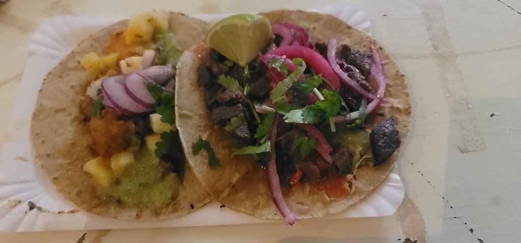 By now it was beginning to rain and it was raining hard (thank goodness we were covered for the most part). As it began to lighten up we began walking to the 3rd place but we had to stop and take cover as it really began to pour and thunder and lightning. All I could think was I’m so glad I did the Berlin history walking tour yesterday because doing that today would not be ideal. Thankfully it eased up and we made it to El Amigo Taqueria which had a cute food truck outside and a small inside seating area. We spent the most time here and I got a chance to meet a couple from Tampa and a couple from London and a couple from Switzerland.