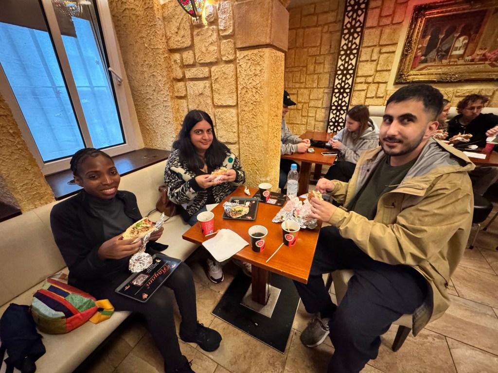 The fourth stop was Rüyam Gemüse Kebab and we made it in as the rain picked up again. I had the best kebab half sandwich and everything in it complimented it so well (from the sauce to the mint, everything). The half was pretty big so I ate half and wrapped the rest up to eat for later. With it we had some hot Turkish tea which was also good. We stayed here for a but as well and chatted. Ines our guide is from France and admitted she doesn’t speak German at all but that she’s in school studying German.