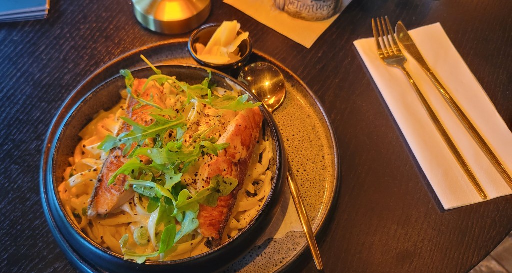 The waiter I found out has family in Virginia and said some of them were in town for an event. I ended up ordering a salmon fettuccine pasta and got a drink called the Hammock which consisted of gin, mint, lime, lime juice, soda water, eldeeflower syrup and cranberry. First off the drink came out looking like a masterpiece and the taste (taste just like a sweet cranberry drink with carbonation-I could taste the gin and this confirms gin based drinks are my favorite). My meal came out shortly afterward and it looked and tasted lovely as well. I had a good time sitting down and enjoying dinner out. The waitress was nice and brought a free drink but I didn’t drink it (you have to be careful out here and wise-I don’t think anything was wrong with it but don’t chance it, especially when solo).