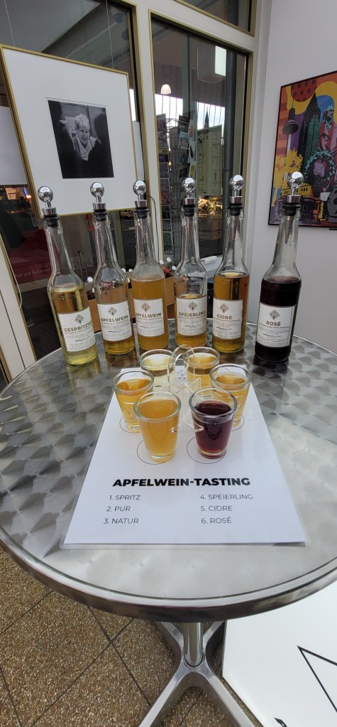 After the tour considering that I couldn’t check in my Airbnb in Munich until after 5pm, it was currently a little after noon and it would take about 3 hours and 20 minutes on the train. This was the perfect time to go to Apfelwein Galerie and do a tasting. I made my way there on foot with all of my bags and thankfully no one else was in there so the gentleman could focus on just serving me. As he laid out the different varieties of Apfelwein he also explained a bit about each one (I really wasn’t concerned with that with all my stuff I just wanted to drink and go). Right in the middle of him pouring my tastings a big group came in and wanted some drinks to go. He asked if it was ok if he took care of them quickly and since I was trying to kill a little bit of time I allowed it.