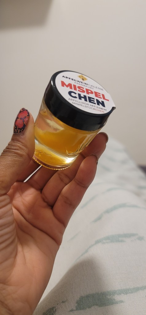 Once done, he finished all my pours and I got a chance to taste 6 different kinds: Spritz, Pur, Natur, Speierling, Cidre and Rosé. My favorite was the Cidre which didn’t surprise me and the experience was worth it. Before leaving I noticed a small glass jar with something inside and asked what it was. He said it was an Apfelweine and Brandy shot and it’s best to take it right after tasting Apfelweine or after eating so I grabbed one to go for later. I noticed upon leaving that it seemed as though the Apfelwein Galeri was a part of a marketplace and so I asked if I could get food inside and he said yes. This was good because I could get something to eat from there and then head to the train station without having to worry to look for food. I ended up stopping at 2 stalls, one to get a spinach andd cheese flatbread and 2 some cilantro lime chicken in a yellow sauce with white rice (I made sure to ask about no nuts being in anything). I bagged my food and headed out towards Frankfurt Central Station.