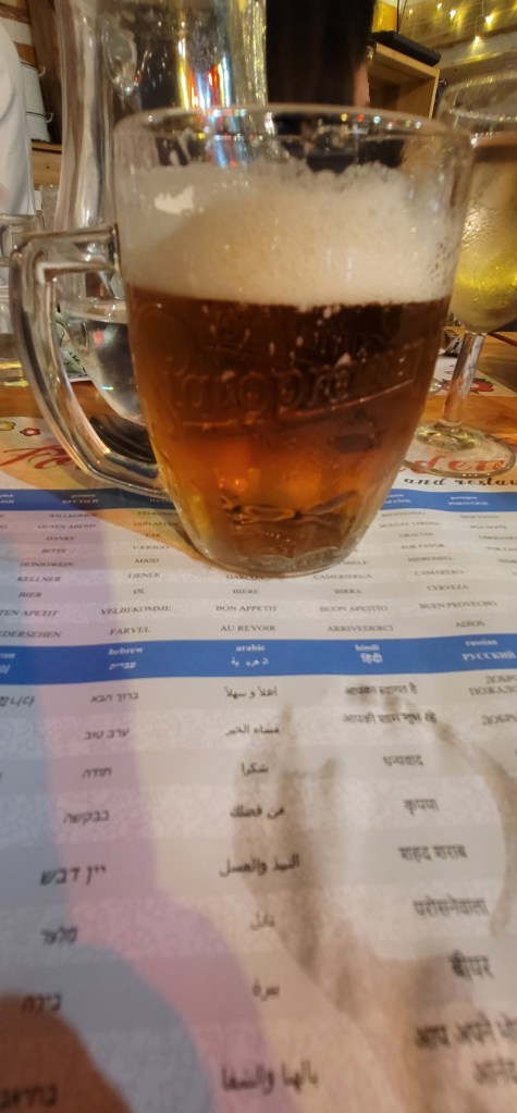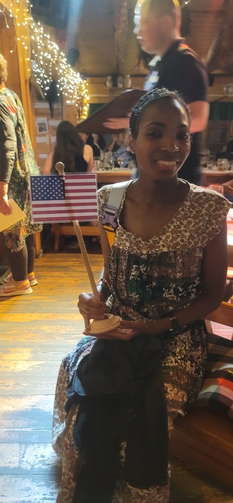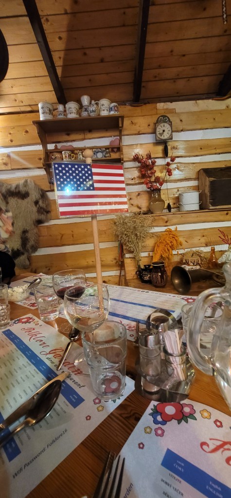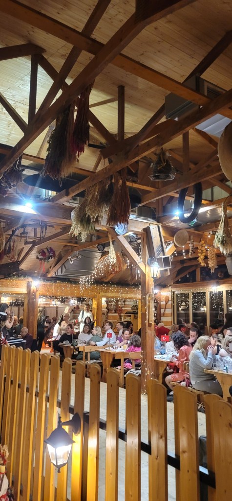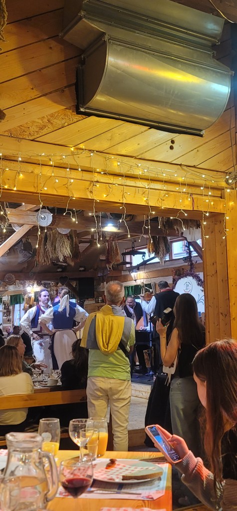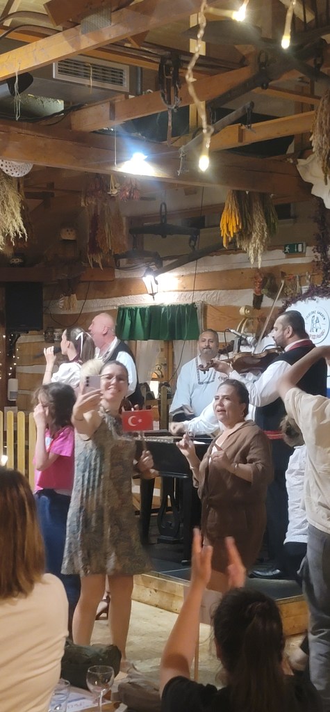 Every table also had a flag of the country in which people were from which was nice to see to look around to see who else was there (I know Canada, Turkey, and Switzerland were there amongst others). There was also a group of people from Texas there as well. The food was tasty and I managed to clean my plate. After dinner and drinks it seemed as though people were more willing to participate in singing along and going up to join them on stage for dancing. They sang “Bella Ciao” and “I Will Survive” and that really seemed to get the crowd going.