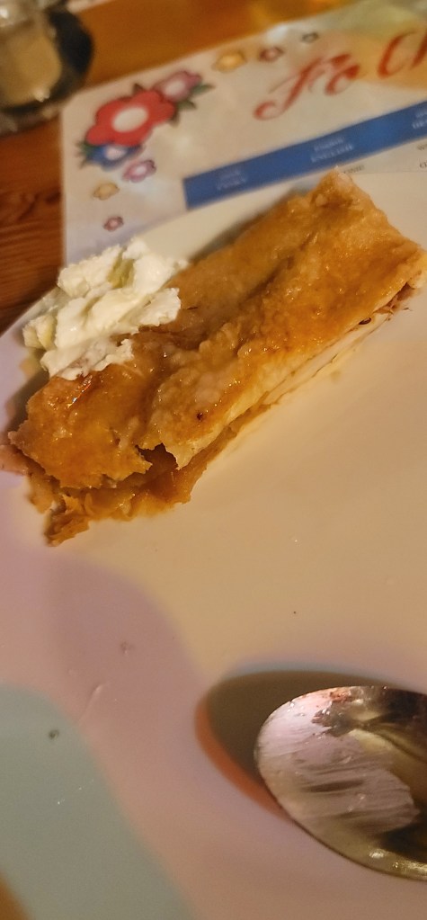 The band played and sang as we enjoyed our starters and I left my beer as I was waiting to drink it with my food as maybe it wouldn’t make me too sleepy on a full stomach. Dancers came out in their traditional attire and did a few performances and they took a few volunteers from the audience. When they said unlimited drinks they meant it too as the table next to us full of mostly guys kept getting their beer refills. All of our food orders had been pre-arranged and I was getting the salmon. The waitress brought out our food and we dug in. For dessert was an apple strudel which I tried but wasn’t a fan of so it stayed on the plate along with a small strong cup of coffee which I took a small sip of because mead, wine and beer then mixed with coffee will have you running to the toilet.
