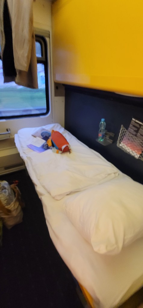 I didn’t matter, I was on the train so if I had to go further up I was walking through the cars. Finally an employee with some sense told me how many cars up I had to walk to get to the right one. Once there I was shown my single compartment. I was mad by now because clearly most people taking a sleeper are tourists, help them, show them where to go, damn! I nearly threw my things down and sat on the bed to catch my breath. I then observed my compartment and waited on another employee (as I could hear him making his rounds) come and give me the rundown.