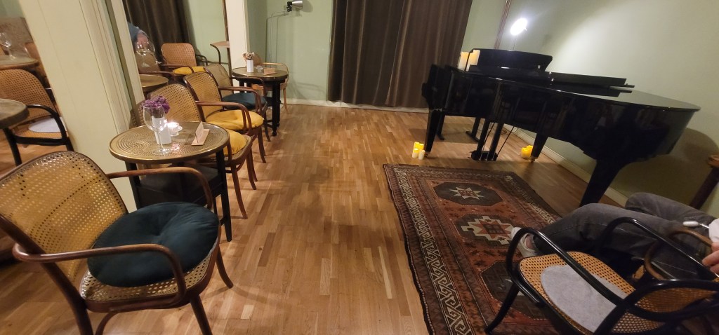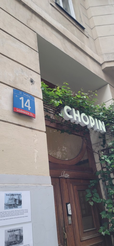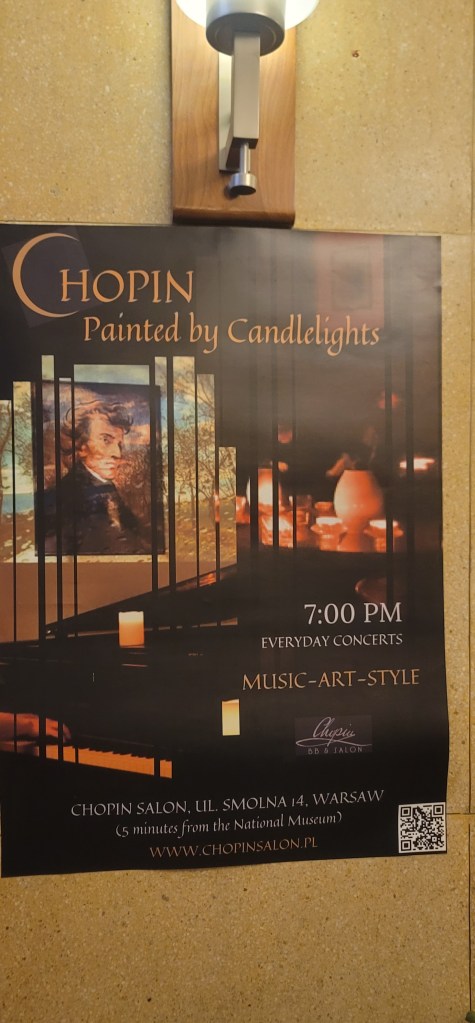 I only had one more activity and that was a Warsaw Concert: Chopin-Painted by Candlelights with Wine at 7pm. Around 6:20pm I got myself together and headed to the venue. I purchased a VIP ticket so I could sit in the 1st two rows and since I arrived early sat up front with my glass of white wine in hand. People began filling in and the show began to start. The pianist Liam is of Polish/American origin and spent time in New York and Texas. He teaches at 2 music schools in Warsaw and online in the U.S.
