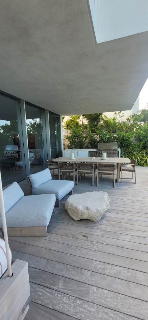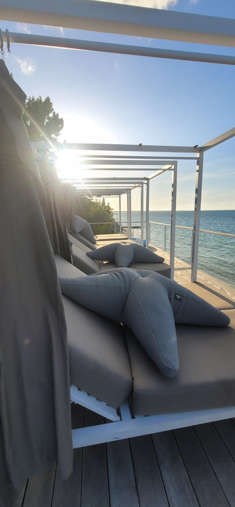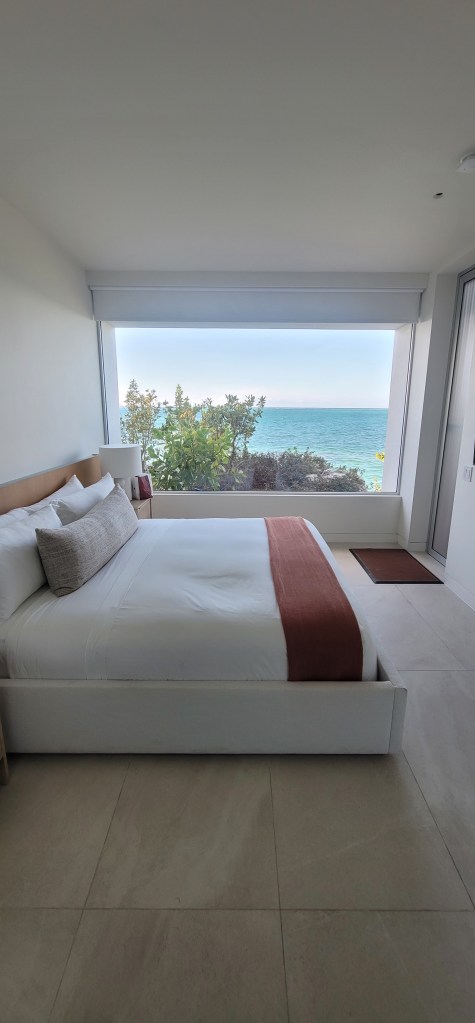 I eagerly went to go scope my room for the next few days and it was beautiful. A huge window wall overlooking the beach below and my own bathroom attached to the bedroom, truly villa like in every way. Further up outside the house is a grilling area with a small infinity pool and beach/lounge chairs with a floating/hanging chaise (which I love). Below my bedroom further down before the beach is a lounge sitting area with a fitness center, an area for yoga and beach bar just around the corner from the villa.