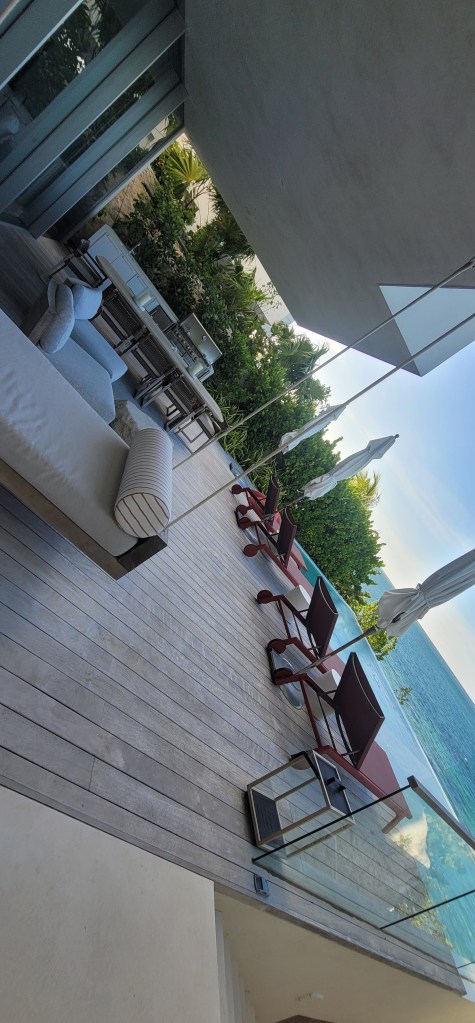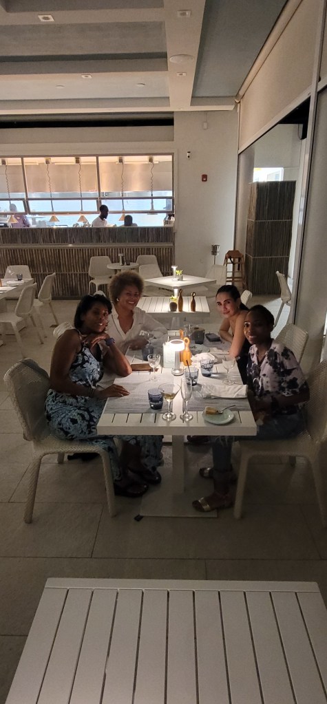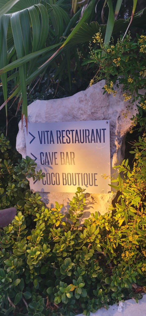 We walked down to the beach area and took a look around. There are paddleboards, kayacks, snorkeling material, a pickle ball/tennis court area and basketball court. There’s so much we can get into right here. We took some time to relax before dinner so I changed shoes and rested in the swinging floating chaise. I took a glimpse at everyone’s room all very lovely with their own bathroom as well. For dinner we began walking to a nearby restaurant on another resort as the chef wasn’t expected to arrive until tomorrow. Halfway in our walk we spotted a golf cart and asked for directions. The gentleman then told us to hop on the cart and he took us the rest of the way which we appreciated.