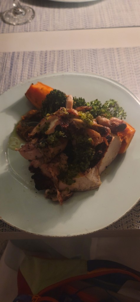 Now I heard Turks and Caicos was expensive and the menu at dinner proved just how expensive it could be (my dish was like $48). I ordered a chicken dish (the chicken was seasoned really well but for a half chicken it seemed small) with vegetables and butternut squash and had a very nice limoncello drink. Ezgi was fascinated with the resort’s cat Rocky that went around from table to table. We enjoyed eating, chatting and planning our days there. Lisa was nice enough to pay for our meal that night. We left and were given another golf cart ride this time to our front gate (which was nice because it was now dark). Everyone decided to turn in for the night and we’ll make use of everything around us tomorrow.