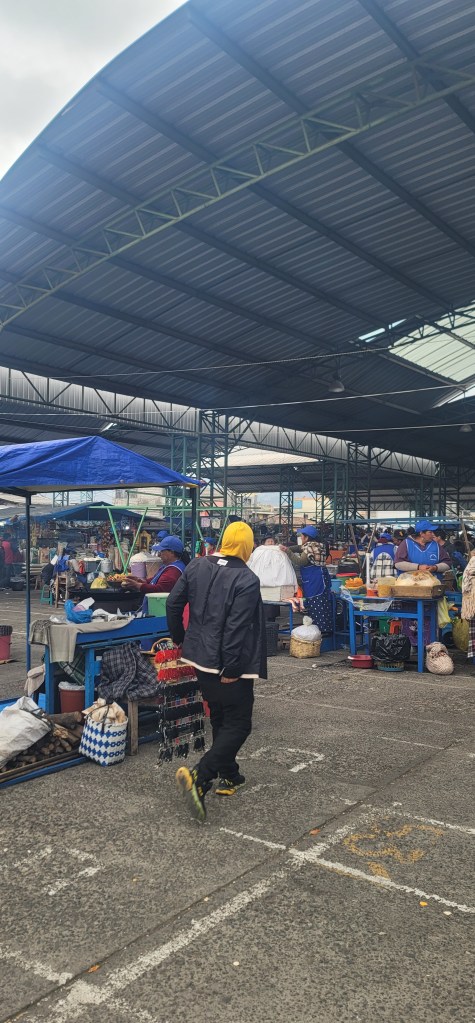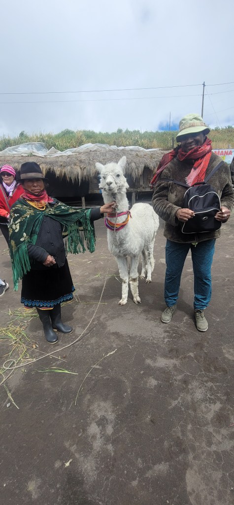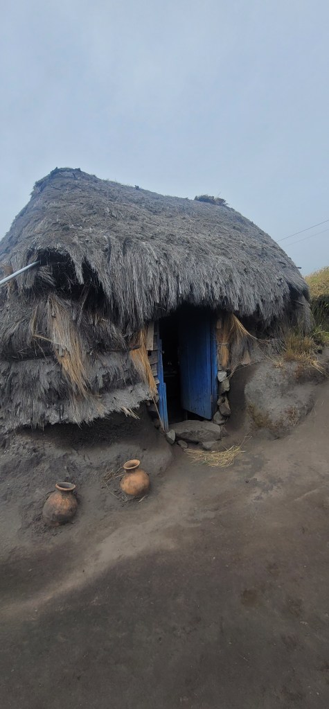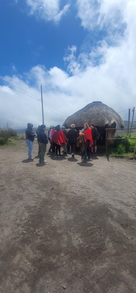 Our first stop was at the town Saquisili in the Cotopaxi province. Here there was a market that we got a chance to go around and look it. We ended up getting a few things at the market (mostly food). There were many dogs there hoping for scraps of food. As we left at some point an artist boarded the van and showed us a bit of his work. I think overall he managed to sell 2 of his pieces. Next we went to the home of an indigenous woman who had her own hut like homes and owned a few animals.