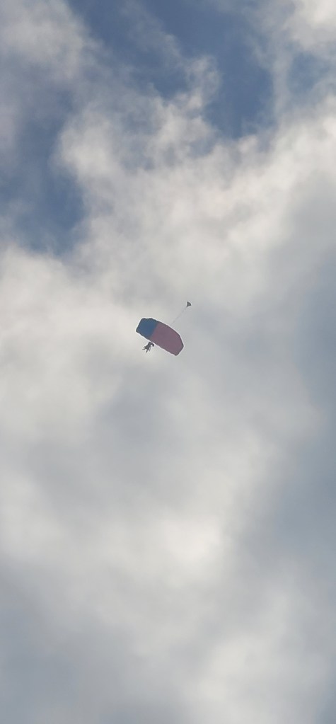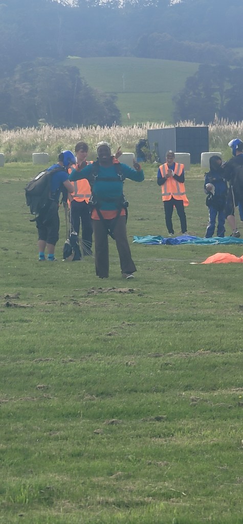 Thankfully another spectator was able to point out her parachute and I was able to follow it as it came down. My mom was the 1st to land and stayed on the ground for a minute so I was checking to make sure she was ok (she said she was taking it all in and thanking God). One by one everyone else in her group landed.