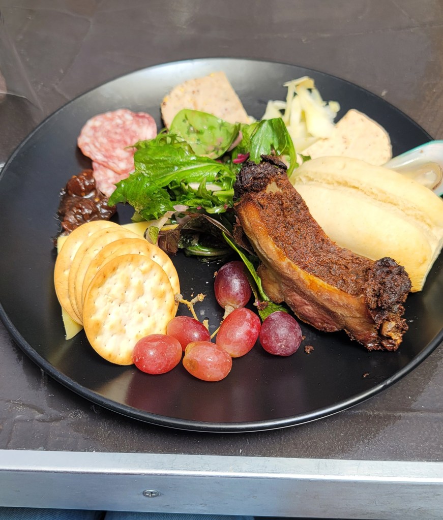 Once we were done with our tasting a nice platter of different foods was brought out to each of us individually. The platter had a rib, grapes, cheese, crackers, a fig type jam, a pork salami, a pork patty, salmon patty, salad, peppers, an oyster and bread. Let me tell you the ribs and the steak I’ve had in New Zealand have been absolutely delicious. I ate everything except the pork salami and oyster but demolished the rest. They also specialize in a dry gin so I had a gin cocktail that included lemonade and tonic water and it was well worth it.