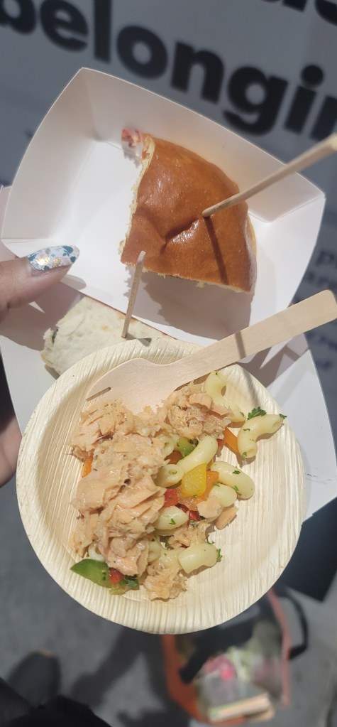 I tried so many things from samosas, to duck, italian meats, cheeses, noodles, pastas, rice, soups, candy, chips, pickles, pistachios, dried fruits and veggies and more. As far as drinks everything from coffee, tea, matcha, lemonade, juice, cocktails, mocktails, sparkling drinks and water it was all there. Around 1:30pm I was feeling the effects of all the food and walking and took a seat to rest myself.