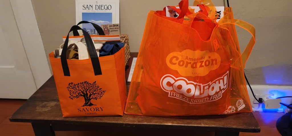 After about 45 minutes sitting I got back up to finish tackling the rest of the floor. By now even more exhibitors should be wanting to get rid of things. Some were even walking around with totes full of things giving them to people (I got a 4 pack of coconut water and a big bottle of avocado oil that way which I clearly can’t take so I gifted it to my host amongst other things). A chocolate station was bagging up an assortment of chocolates and thankfully the tuna station was trying to get rid of cans.