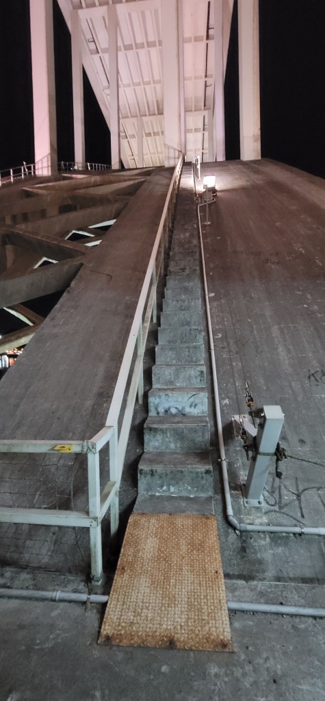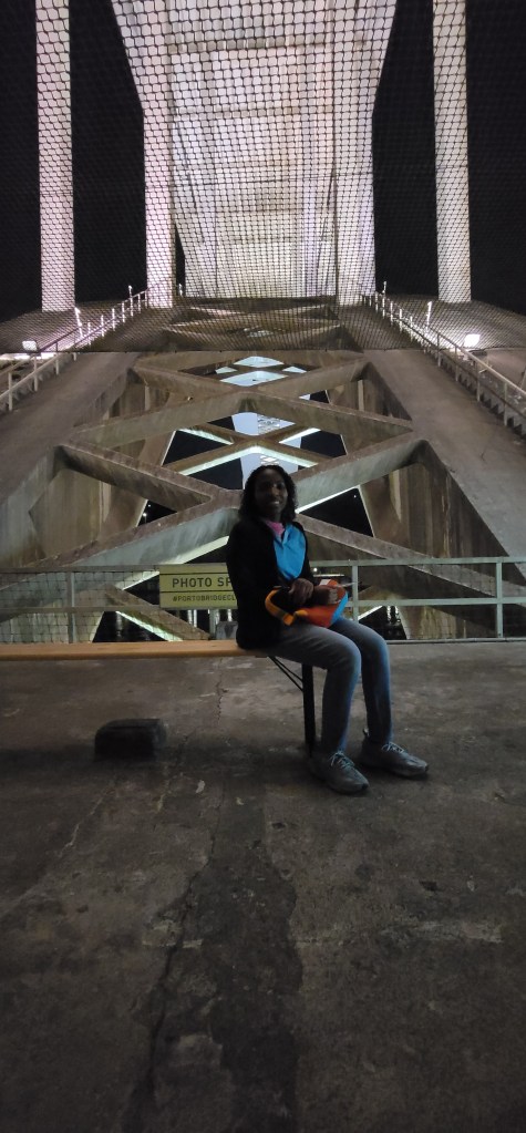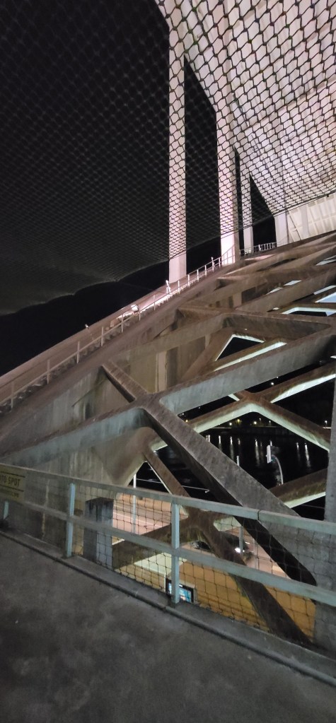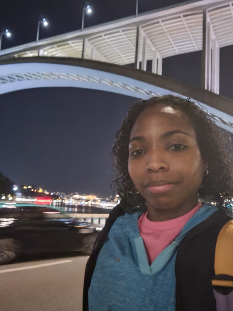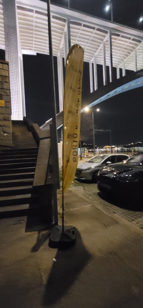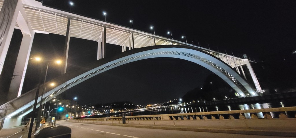 Think of a stairmaster in a gym but on a bridge literally 18 stories up. That’s what I walked to get to the top and after walking halfway to the bridge my body was already warmed up. I started with great momentum but got slower further up. Not once did I look down as I was going up. Seeing the view at the top at night was beautiful. Helena took a few pictures for me and poured me a small sample of some red port wine in a little chocolate cup (it was good). She also told me some interesting things and stories about the Arrábida Bridge, here’s a little bit: