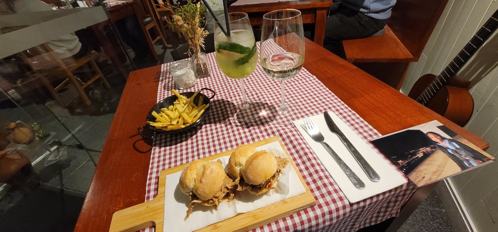 Helena recommended some sites to see in the area and we walked back down. She printed out one of the photos that she toook of me and gave me a postcard. I thanked her again and I left. I walked to a nearby small restaurant called Viela D’Ouro which had 5 stars rating reviews on Google. I ordered a glass of wine, sangria and a pork sandwich dish which was delicious. It all came up under 15 euros but it was well worth it. Afterwards I walked to the bus stop and decided to wait for it. It dropped me off a few blocks from the metro and I easily made my way back to the Airbnb. I started posting when I got back but at some point fell asleep. Day one in Porto is done.