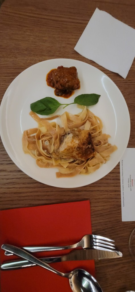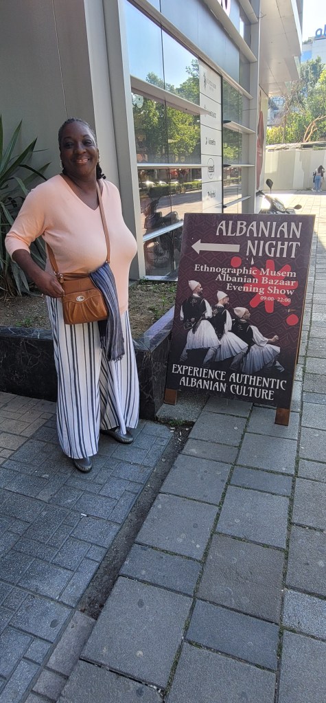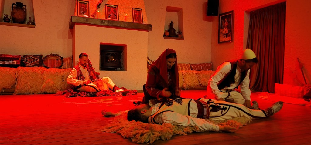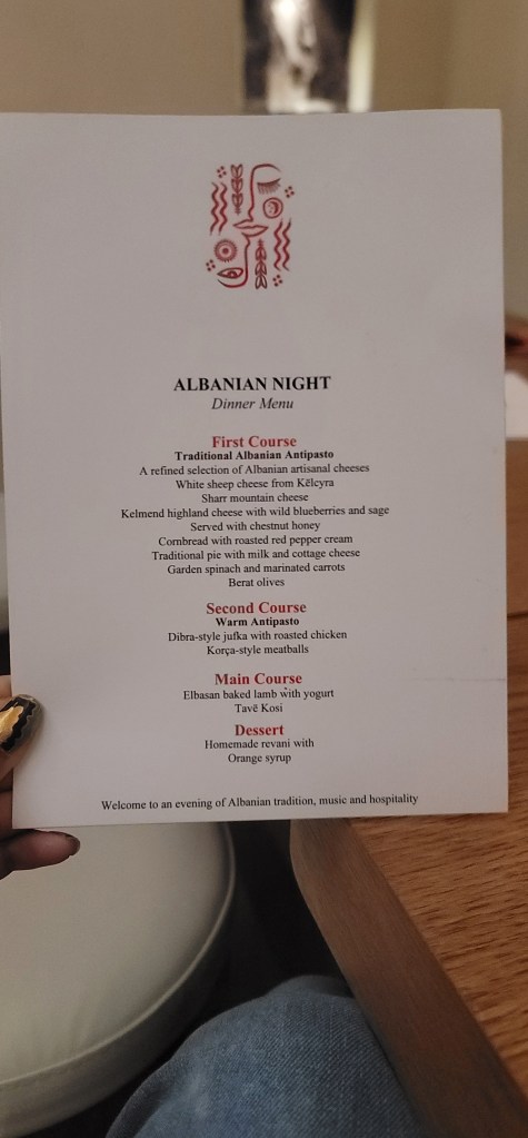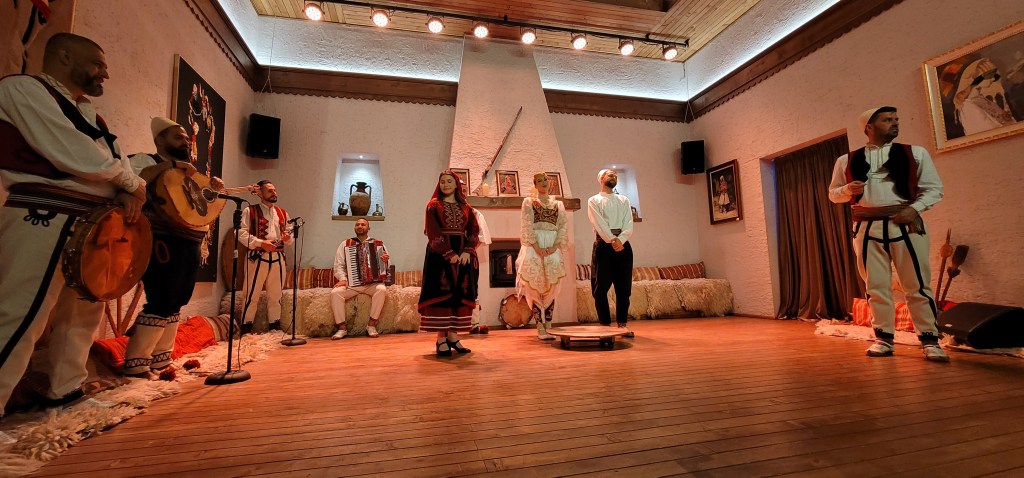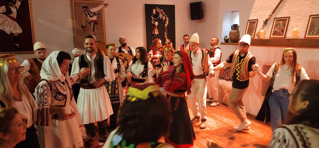 The show began but as you can imagine this is no traditional show. This show requires crowd participation from answering, clapping and dancing. It was good to hear some Albanian music, see the traditional clothes and laugh along with the cast and crowd. One thing’s for sure is that I didn’t expect the ending. Since we opted for the dinner included portion we then went and ate and met Greg from Hickory, NC. We chatted over dinner and enjoyed the meal (dinner was ok).